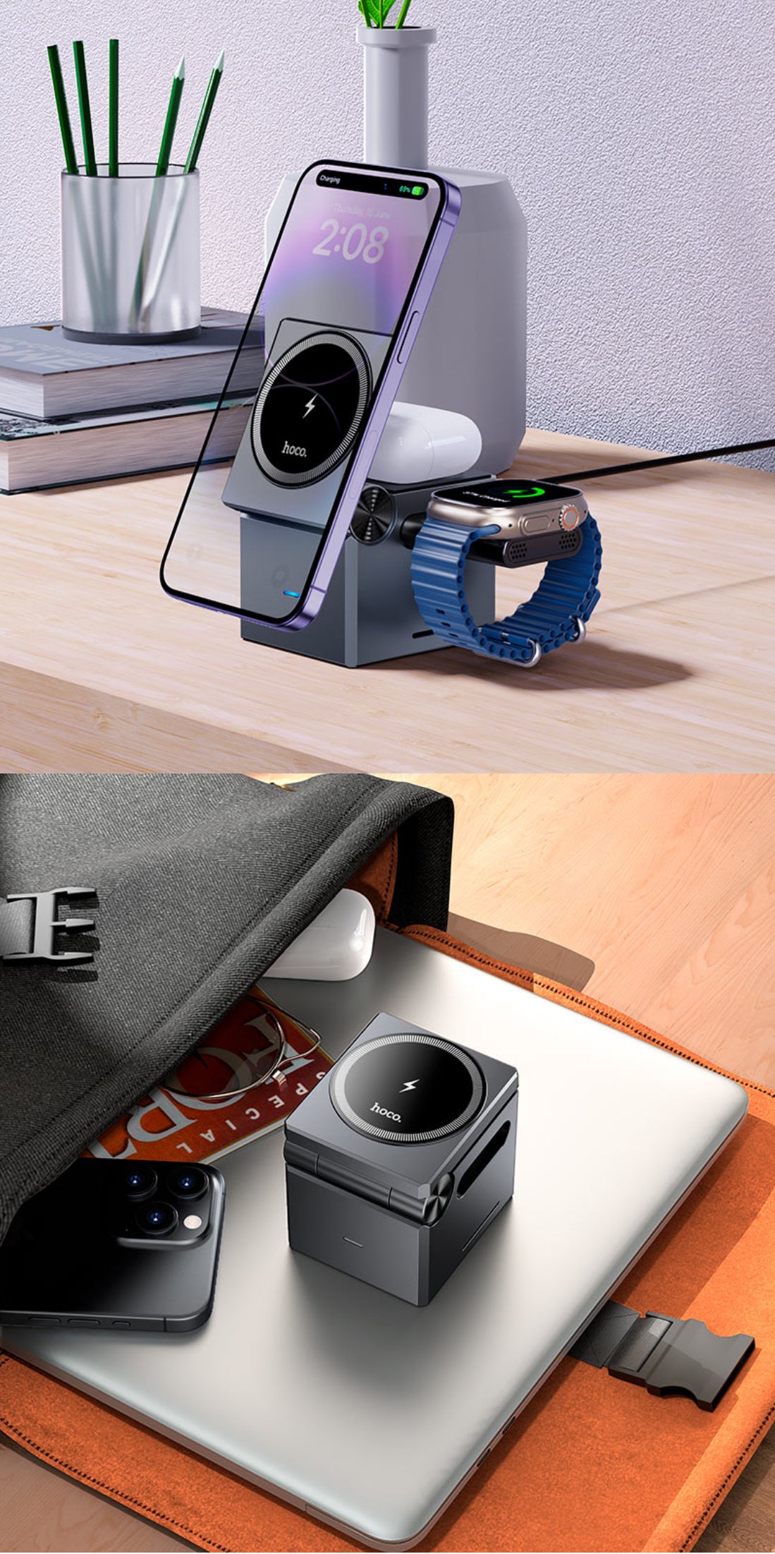 3. Magnetic, foldable, with detachable watch charging pad.